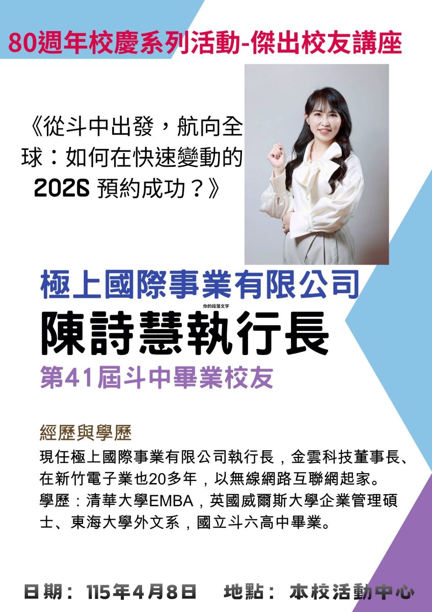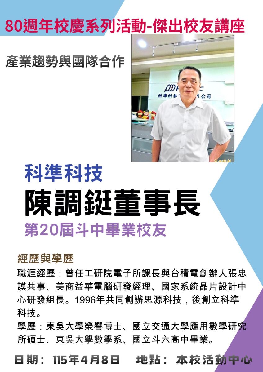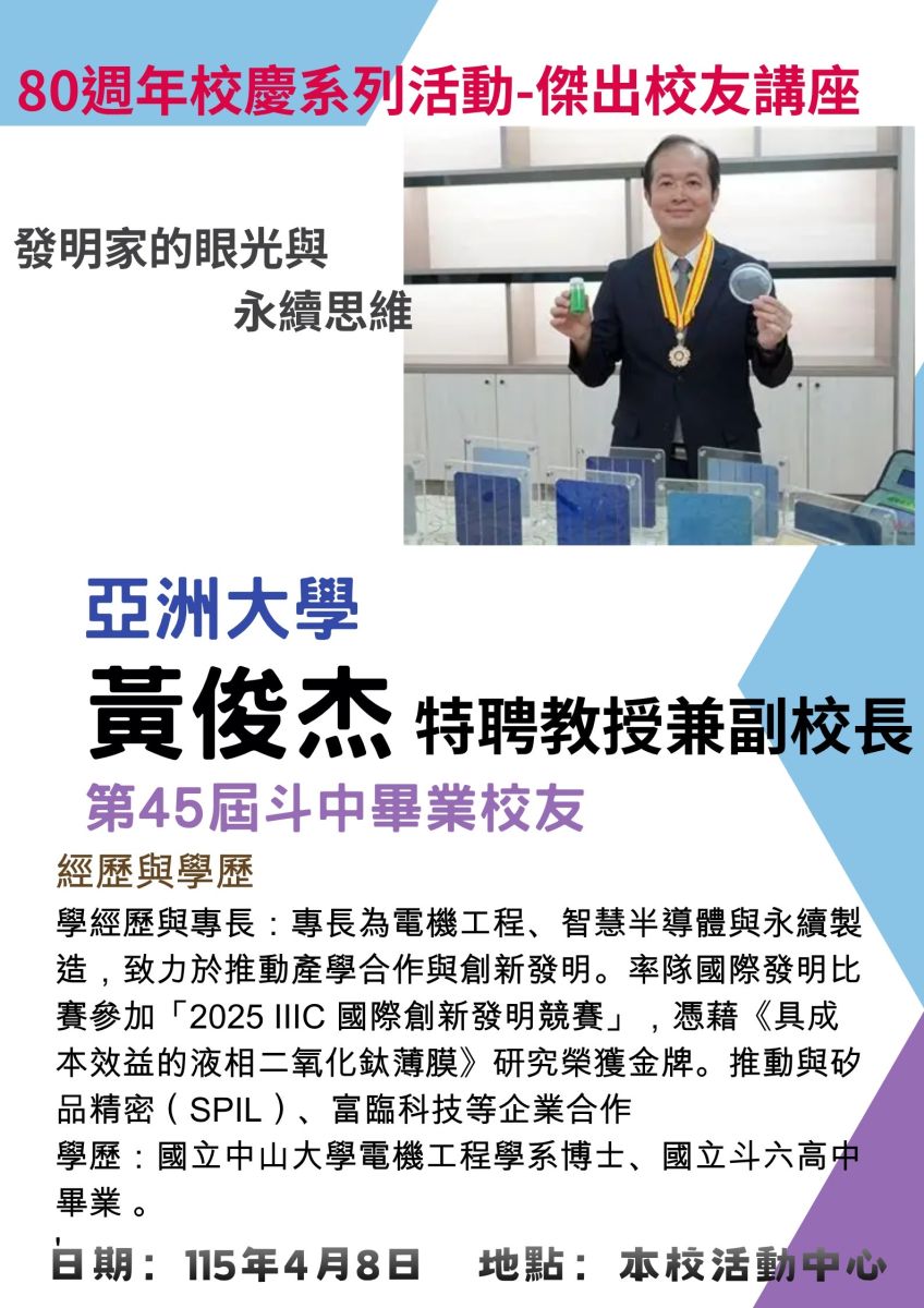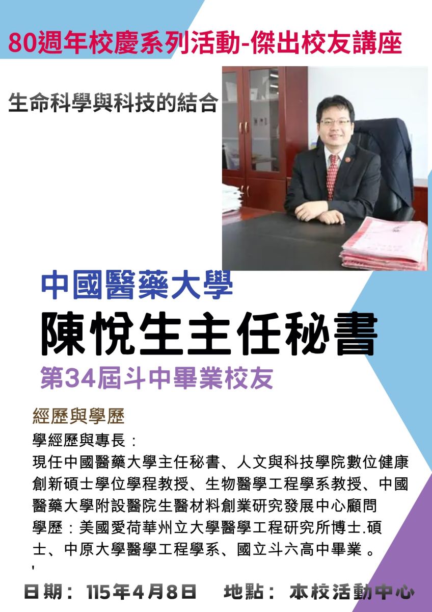 國立斗六高中辦理慶祝80週年校慶系列活動,於4月8日(星期三)下午1點-3點辦理傑出校友經驗分享講座,特別邀請20屆陳調鋌校友(竹南科學園區科準科技股份有限公司董事長、東吳大學榮譽博士兼講座教授、斗中校友總會榮譽理事長)、34屆陳悅生校友(中國醫藥大學主任秘書、前任教務長、生物醫學工程教授)、45屆黃俊杰校友(亞洲大學副校長、資訊工程學系特聘教授、前雲科大教授)三位傑出校友擔任主講及與談者。邀請41屆陳詩慧校友(極上國際事業執行長,電子通訊產業專業講師)由新竹南下擔任主持人與引言人。